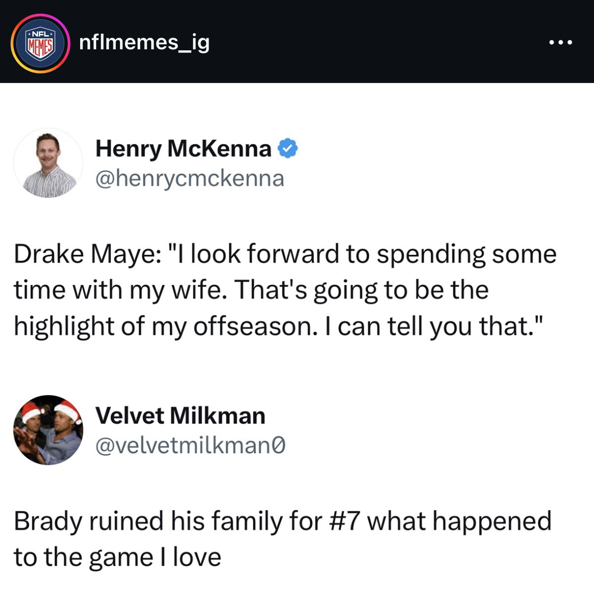 Last year’s Patriots? I hope they bounce back because these fans deserve more than one year of relevance. Can we get Jayden’s mom in uniform to block and protect him, like she does with girls?
