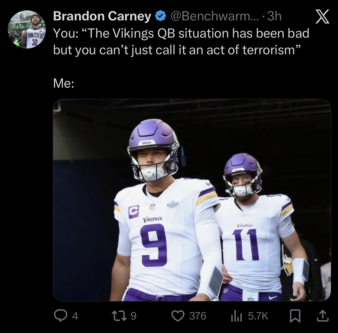 Super solid team other than Nine, Rodgers, and CJ Stroud. Trying to pick which 2 QBs will be the least shitty is a nightmare I know all too well, and it's the reason I overpay for Josh Allen now.